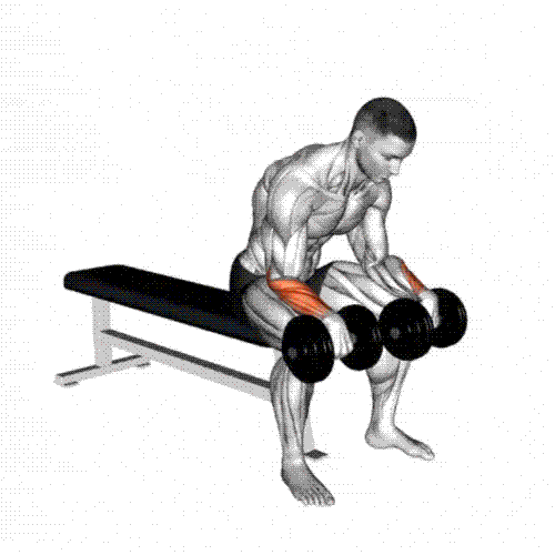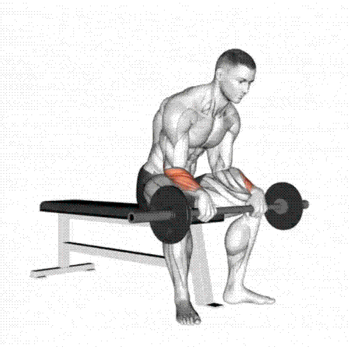 While sitting on the bench, grasp the barbell slightly narrower than shoulder-width with the back of your hands facing the sky and place your forearms on a bench.