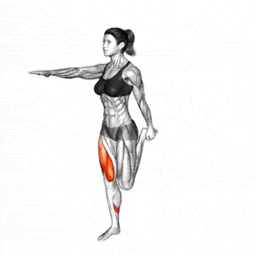 Stand on one leg, grab the opposite ankle behind you with the same-side hand.