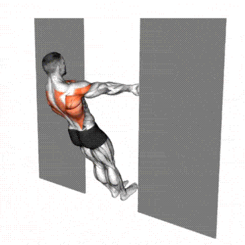 Pull your chest toward the door frame by driving your elbows back.